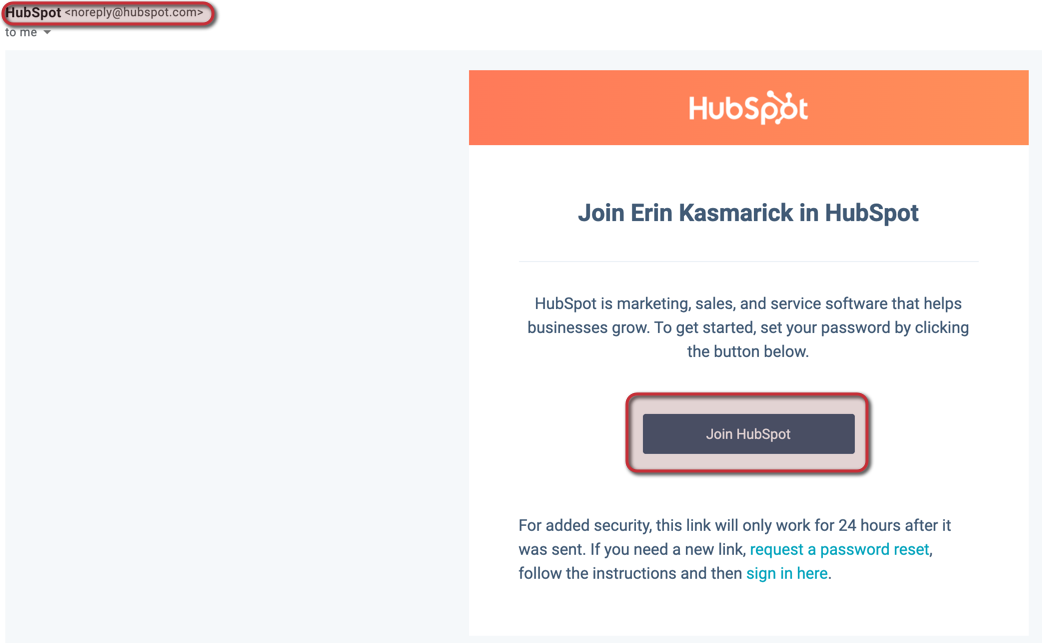 - You will receive an email welcoming you to join HubSpot. Click the link to set your password. Your username will be your email address.